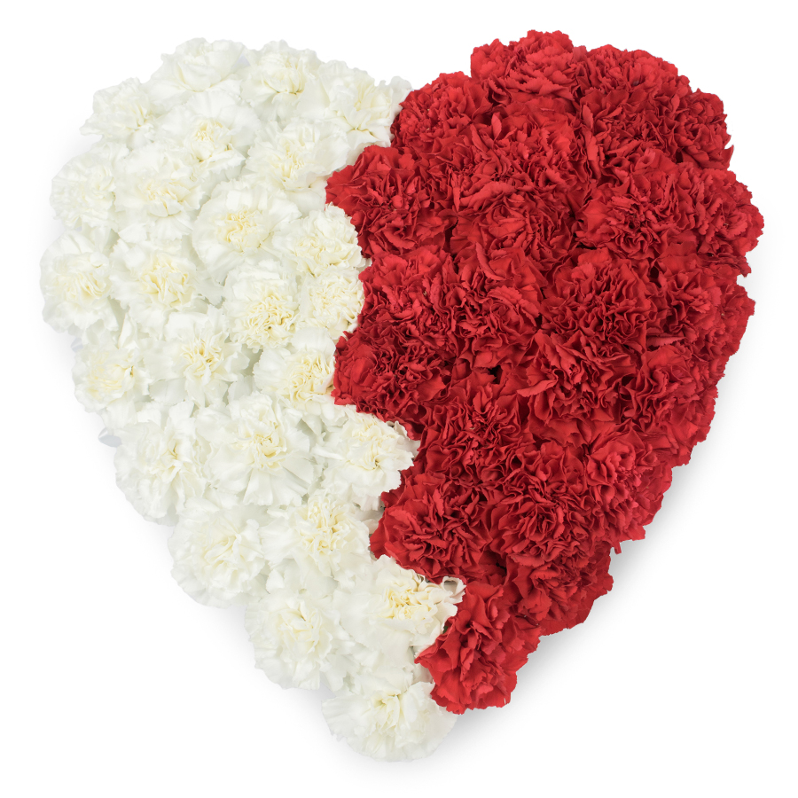 Discover the stunning beauty of our heart-shaped mixed carnations bouquet, expertly crafted by Handy Flowers. This exquisite arrangement showcases a harmonious blend of white and red carnations, perfect for expressing heartfelt sympathy.